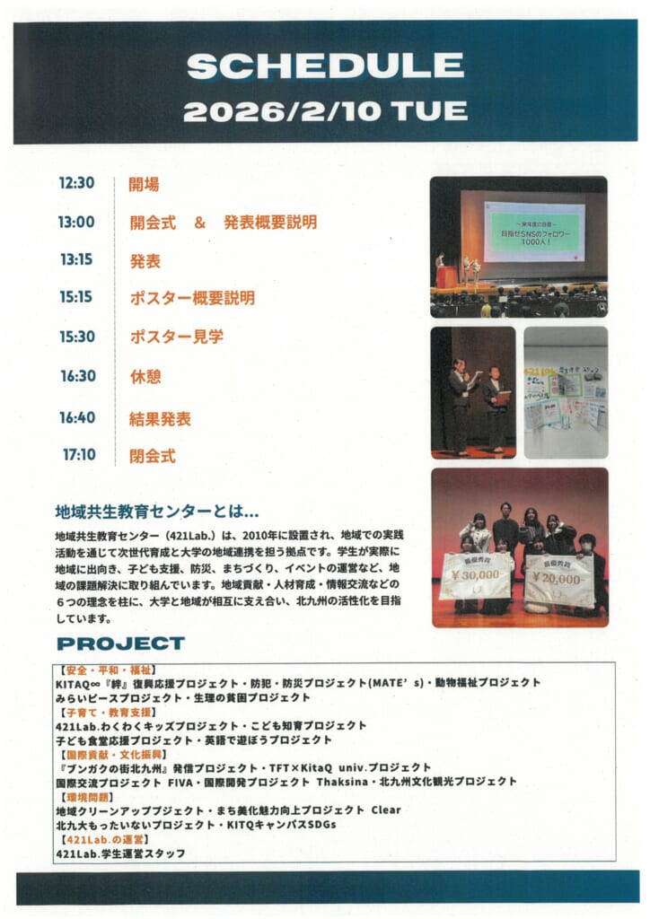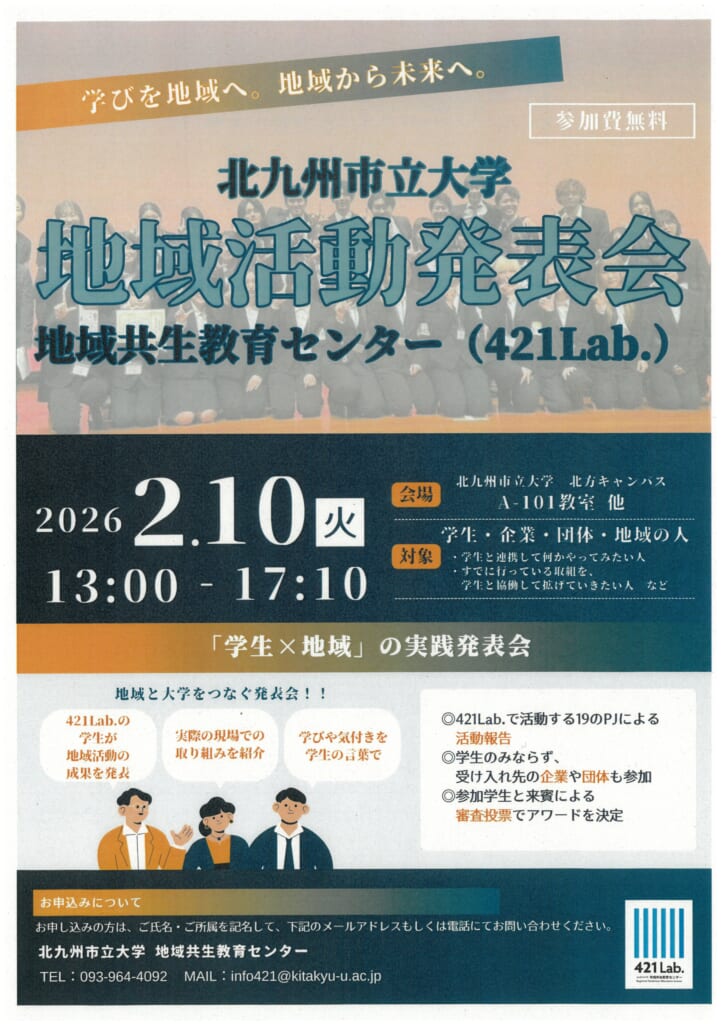 地域活動発表会を開催します! 2026年2月5日(木) 地域共生教育センター(421Lab.)では、防犯防災やSDGs、国際交流等、様々な目的で19の学生プロジェクトが地域活動に取り組んでいます。1年間の集大成として、各プロジェクトの活動成果をポスターやスライドを使用して「地域活動発表会」で発表します。 入場無料でどなたでも自由に参加できます。どうぞ足をお運びいただき、学生の地域活動の発表をご覧ください。 詳細はチラシ参照 前の記事 お知らせ一覧 次の記事