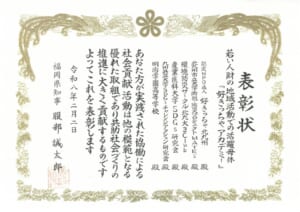 福岡県知事様より防犯・防災プロジェクト(MATE’s)へ、「若い人材の地域活動での活動団体『好きっちゃアカデミー』のメンバーとして「ふくおか共助社会づくり表彰」の盾と表彰状をいただきました。