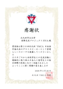 北九州YMCA様より英語で遊ぼうプロジェクトへ、YMCA学童クラブでの活動に対して感謝状をいただきました。