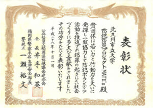 (公社)福岡県防犯協会連合会長・福岡県警察本部生活安全部長様より防犯・防災プロジェクト(MATE’s)へ、防犯活動に対して表彰状をいただきました。