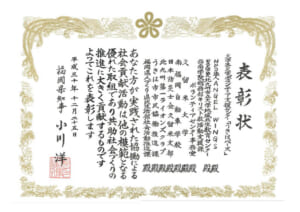 福岡県知事様より地域共生教育センターへ、大学生災害ボランティア支援センター「うきはベース」での活動に対して表彰状をいただきました。