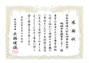 北九州市長様より地域共生教育センターへ、子ども食堂活動に対して感謝状をいただきました。
