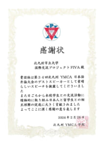 北九州YMCA学院様より国際交流プロジェクトFIVAへ、本校学生との交流活動に対して感謝状をいただきました。