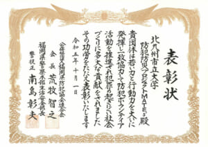 | 授賞団体 | (公社)福岡県防犯協会連合会長・福岡県警察本部生活安全部長 |