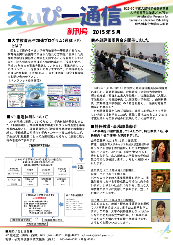 学内広報誌としてえいぴー通信を作成・発行し、学内教職員及び学生を対象に配布・掲示を行うことでAP事業の周知や理解を図っています。平成28年度は、5月、9月、1月と計3号を発行しました。各号400部を配布し、周知活動を行いました。