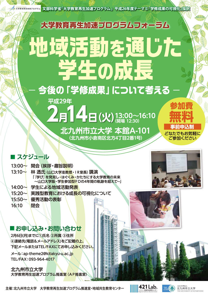 『大学教育再生加速プログラムフォーラム 地域活動を通じた学生の成長-今後の「学修成果」について考える-』と題し、平成29年2月14日(火)に、本学北方キャンパスにて開催しました。実施内容は以下のとおりです。