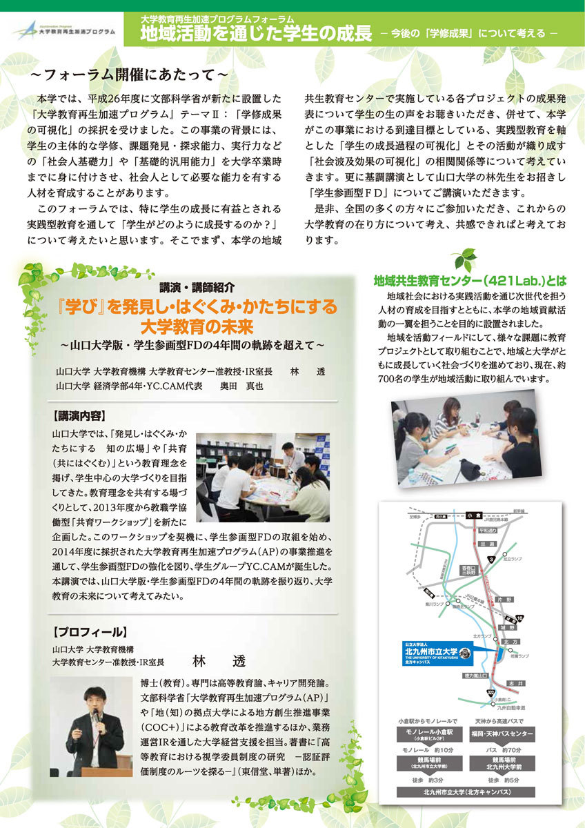 - 山口大学IR室長 林透准教授、YC.CAM奥田代表(山口大学学生)による講演「『学び』を発見し・はぐくみ・かたちにする大学教育の未来~山口大学版・学生参加型FDの4年間の軌跡を超えて~」