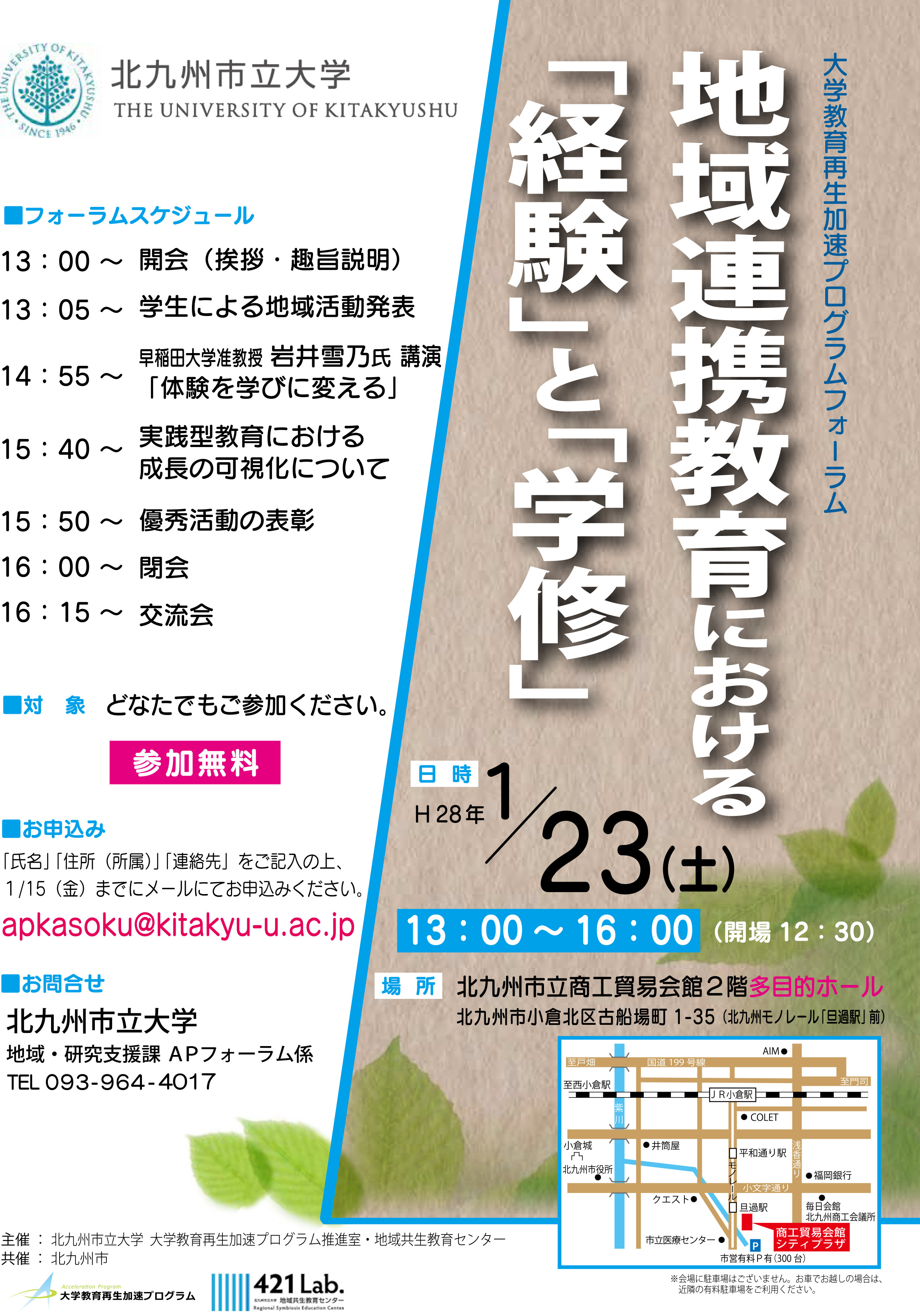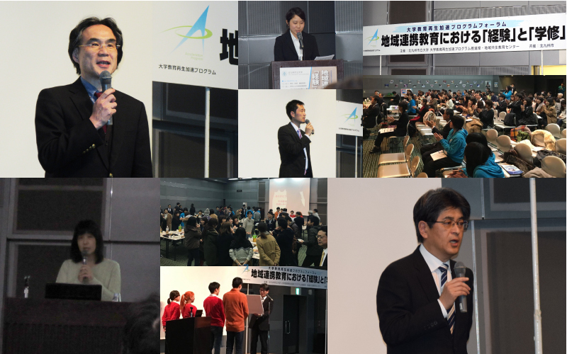 『大学教育再生加速プログラムフォーラム -地域連携教育における「経験」と「学修」-』と題し、H28年1月23日(土)、北九州市立商工貿易会館にて開催しました。本学FD委員会共催でFD活動と位置付け、地域共生教育センターと合同企画することで、学生・地域受入先関係者・本学内外の教育機関関係者など158名が参加下さいました。内容は、「学生による地域活動発表と表彰」「早稲田大学 岩井雪乃准教授によるご講演『体験を学びに変える』」「本学AP活動概要のご報告」でした。