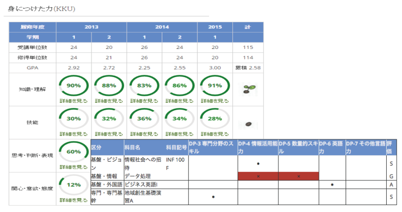 本学では、「公立大学法人北九州市立大学 教育の3つの方針」の学位授与方針(DP)にて4つの観点(①知識・理解、②技能、③思考・判断・表現、④関心・意欲・態度)を設定しています。教育ポートフォリオシステムは、学生毎に4つの観点に関わる能力等の修得状況を段階的に測定して学生の学修成果の可視化を図り、学生自身がその可視化された情報に基づいて自分の学修成果に関する省察を行うものです。これにより、教員は学生の学修成果を確認し、学修成果の振り返りに対してフィードバックを与えることができます。また、本システムを活用することで、本学が提供するカリキュラムや授業の問題点を見出すためのデータを蓄積することが可能となり、本学の教育分野におけるPDCAサイクルの確立に寄与することが期待されます。