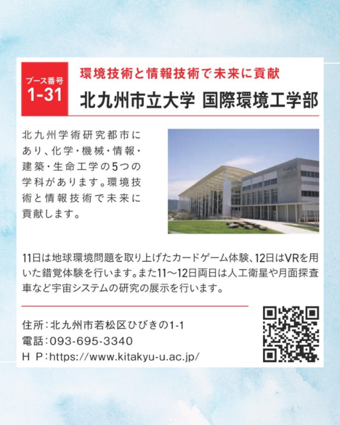 12月11日(木)、12日(金)に北九州メッセで開催される「北九州ゆめみらいワーク2025」に北九州市立大学国際環境工学部が出展します!